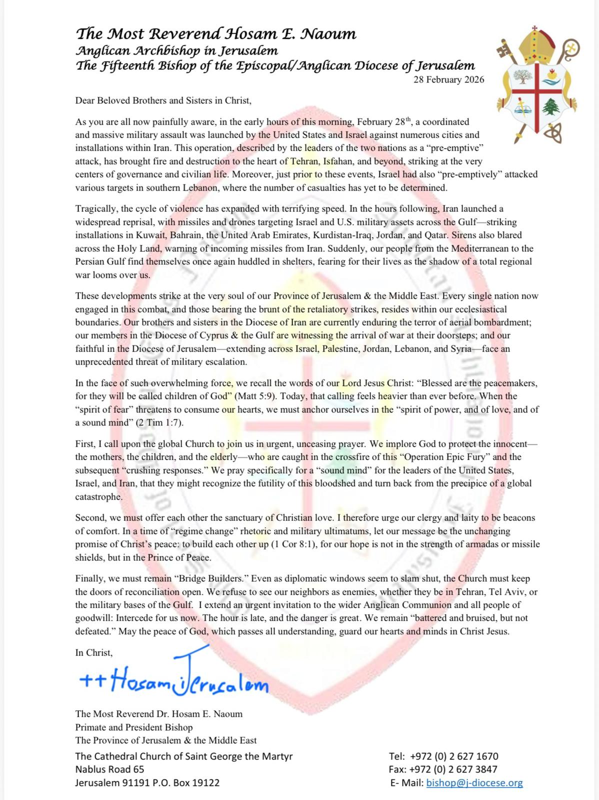 The Most Revd Hosam Naoum, Anglican Archbishop in Jerusalem and Primate of the Episcopal Church in Jerusalem and the Middle East, has today (28th February 2026) shared a pastoral letter following on from the news of the escalating conflict in the Middle East.